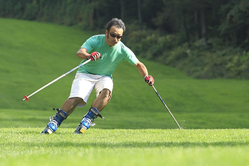 - キャタピラ状の板で芝を滑走するスポーツ。基本操作は通常のスキーとほぼ同じ。雪上のように板が横滑りすることがないので、基礎がしっかり身に付きます。