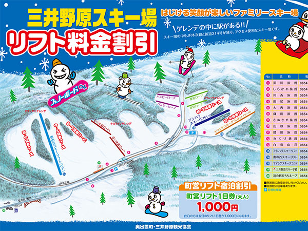 松江・出雲の市街地から1時間余りと行き易く、国道沿いのドライブイン三井野で駐車場・昼食・休憩・用具のレンタル対応。ソリや雪遊びにも最適です。